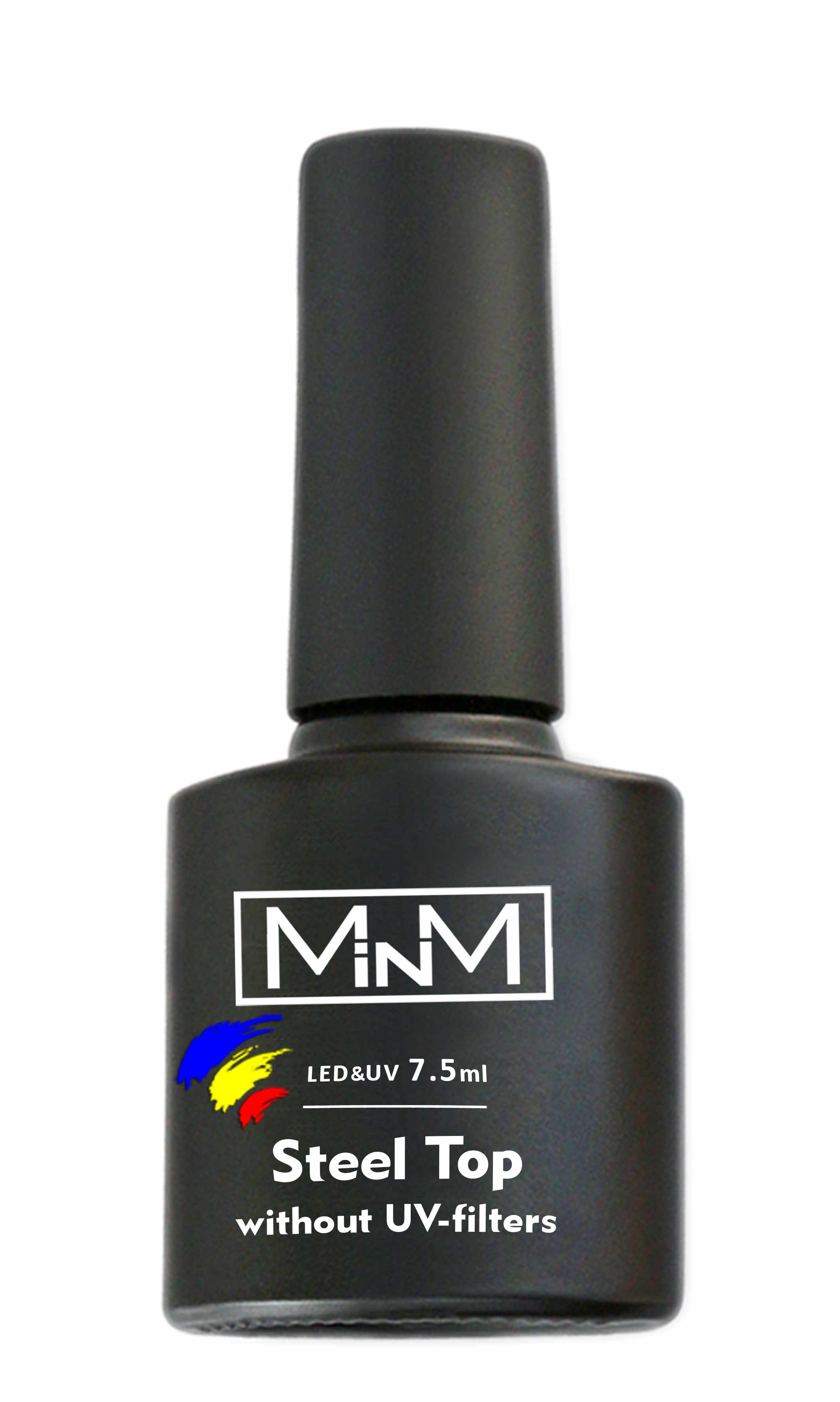 Стальной топ без УФ-фильтров и без липкого слоя M-in-M No Wipe Steel Top without UV filters отлично подойдет для любительниц элегатного черного маникюра. Финишное покрытие не искажает оттенки гель-лаков, придавая стойкий глянцевый блеск и яркость гель-лакам. Идеален для черного, красных оттенков, темных цветов, термо гель-лаков и неоновых цветов. Защищает маникюр от царапин, сколов, трещин, выгорания и помутнения цвета, а так же придает стальную прочность гель-лаку.